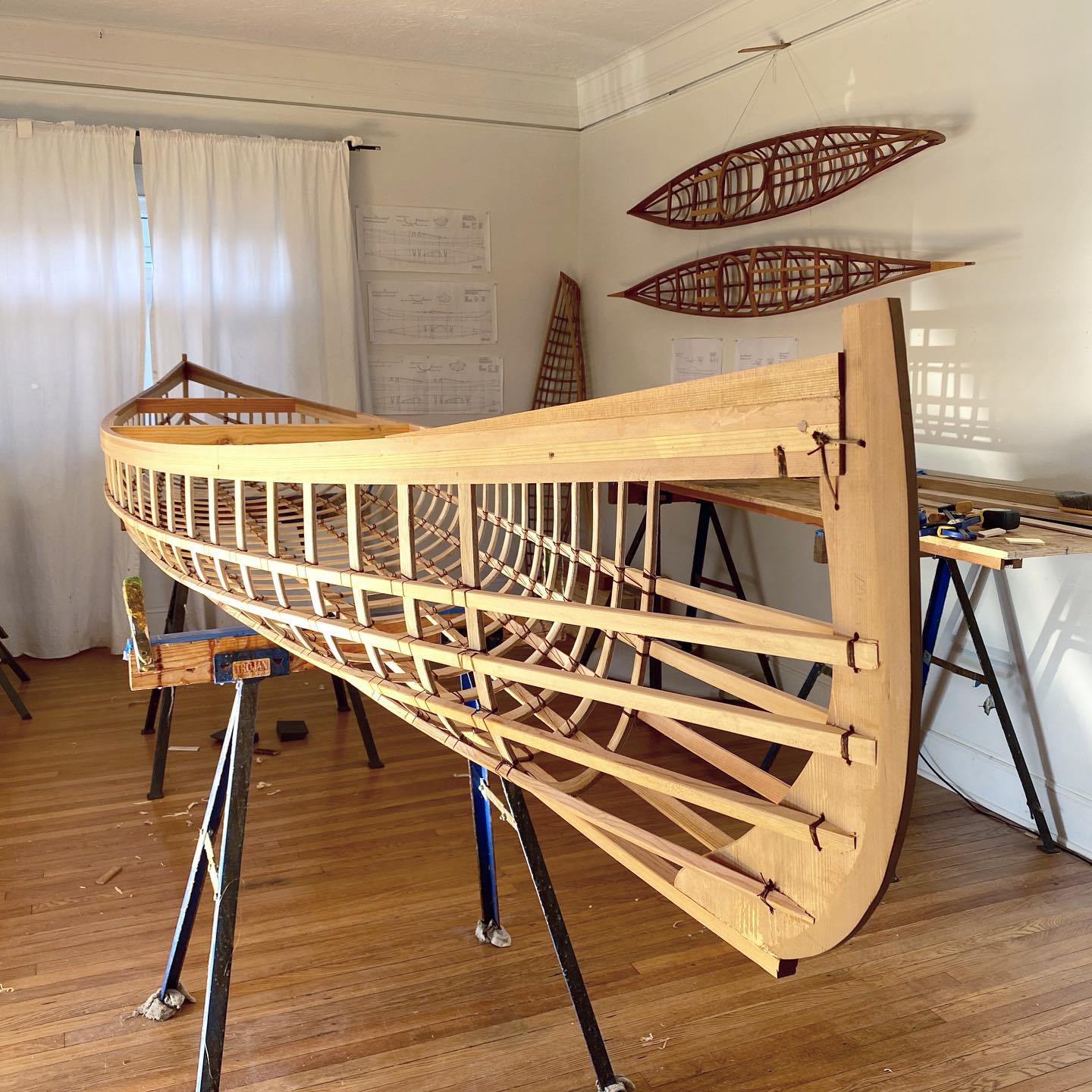 Being able to see the water through the boat is one of the cooler things about skin on frame construction. I’m mostly concerned with waterline widths and turbulence, which is why I appreciate Liz pointing out this special moment of sunlight reflecting at the waters edge....