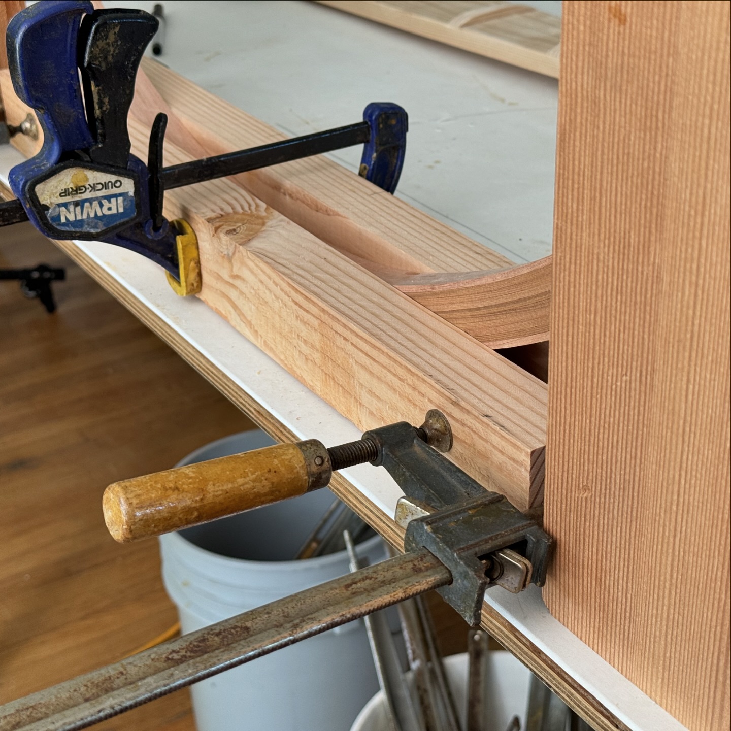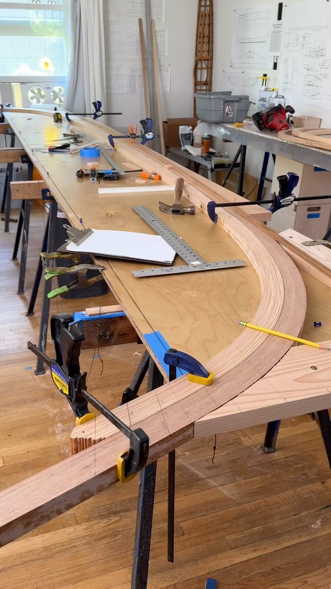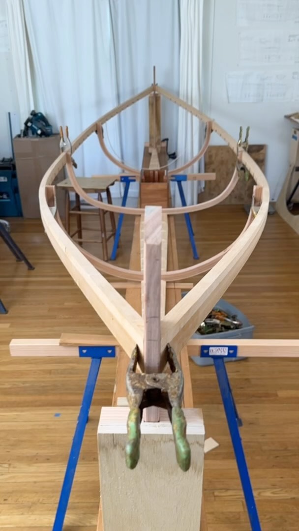More work on the Saint Lawrence River Skiff. Little bit of a trick to keep the sheer line level and also flatten the bottom of the frame at the correct angle to intersect with the wide keel to keep everything plumb. I’m literally just posting this so I can remember how to do it...