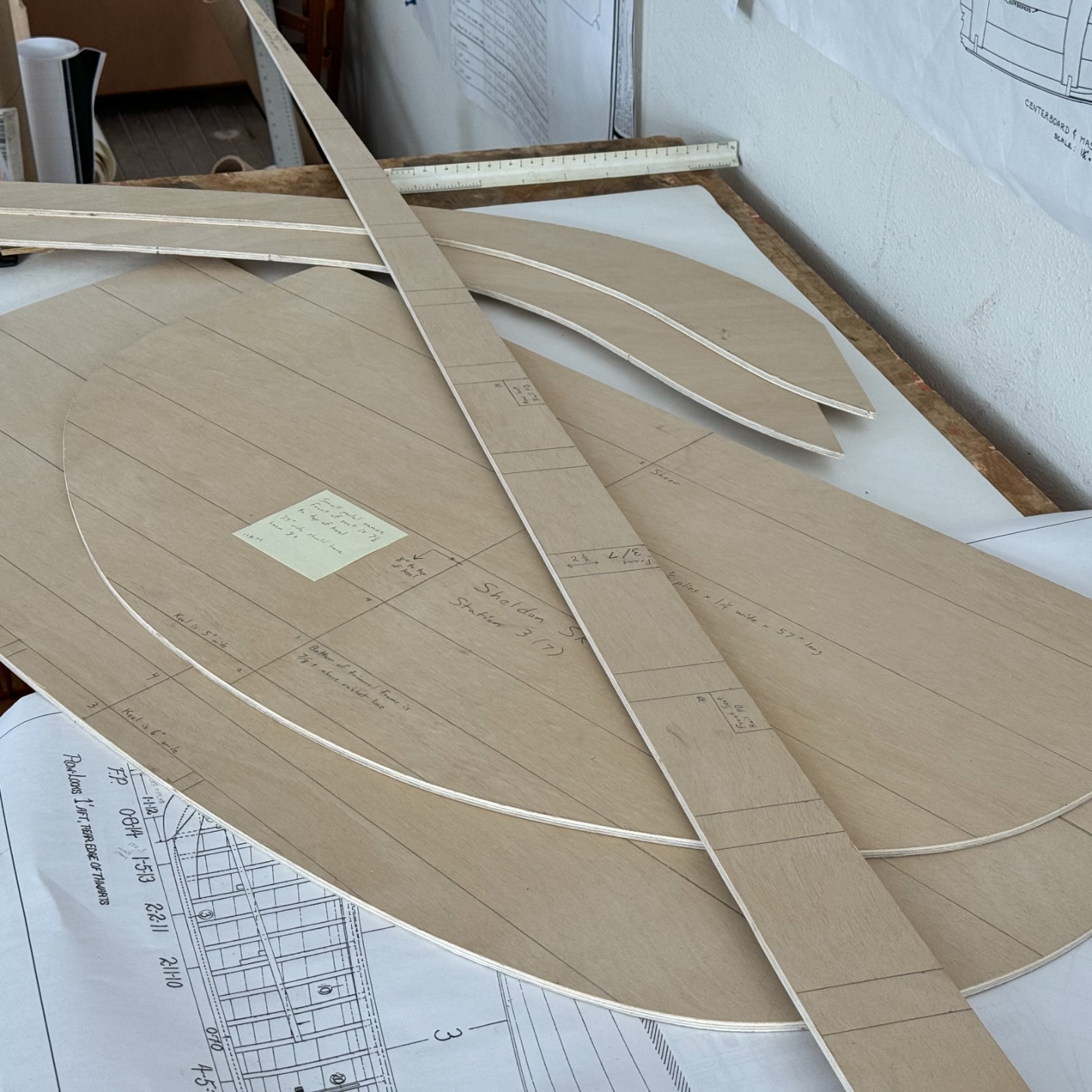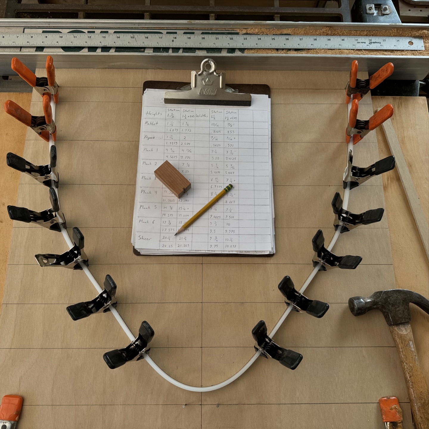 Looked down yesterday to realize that my work table is currently the Noah’s ark of measuring devices. What I’m doing here is trying to figure out how high I can raise the sheer at the ends of the boat. From personal experience, I know that this Shearwater will take waves over the bow in...