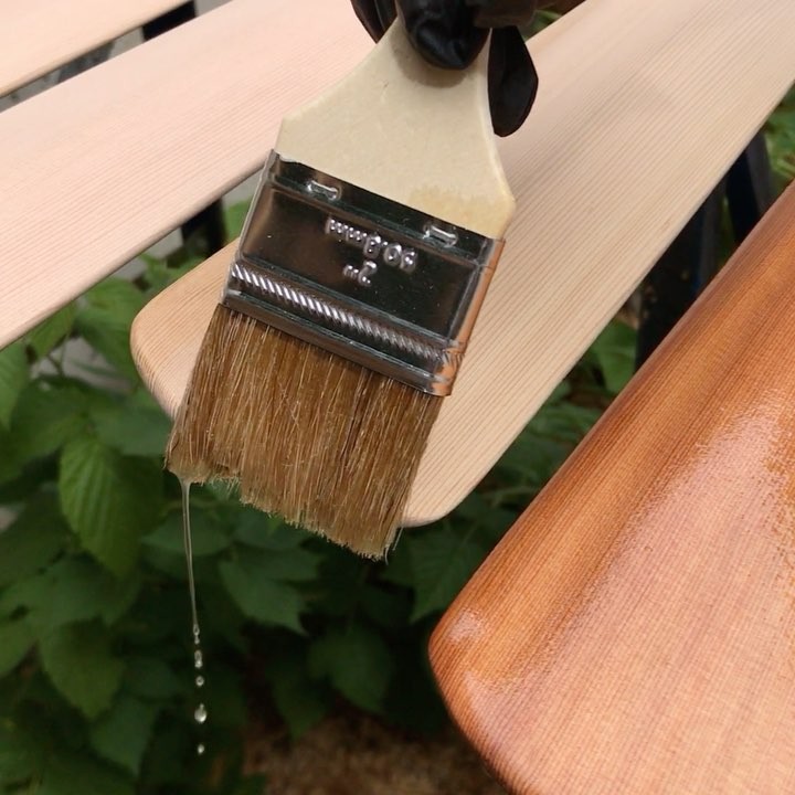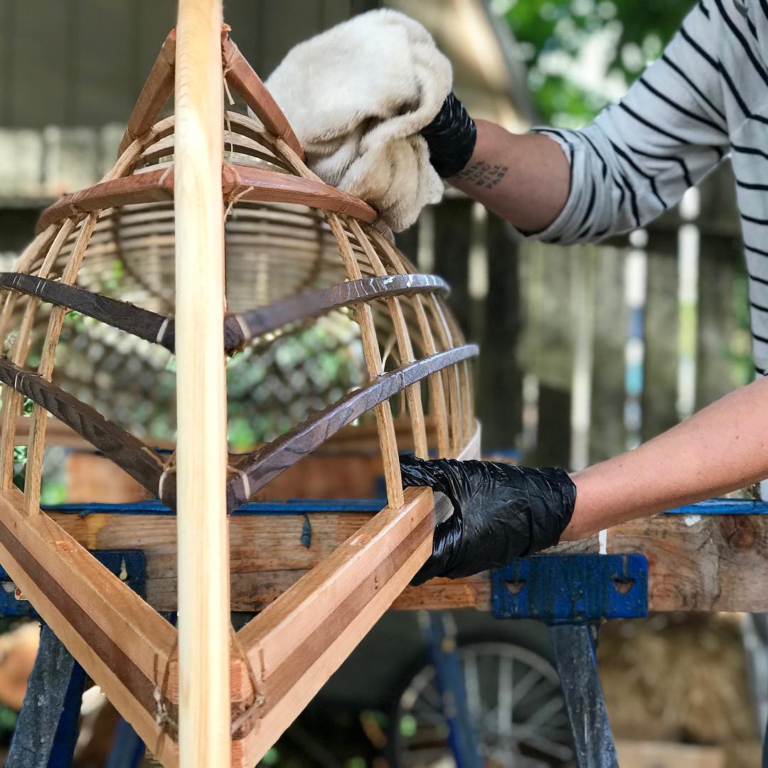 Oiling one of the canoe frames. This one uses fir for the keel and lower stringers, for greater durability, which contrast nicely with the dark red cedar of the upper stringers....