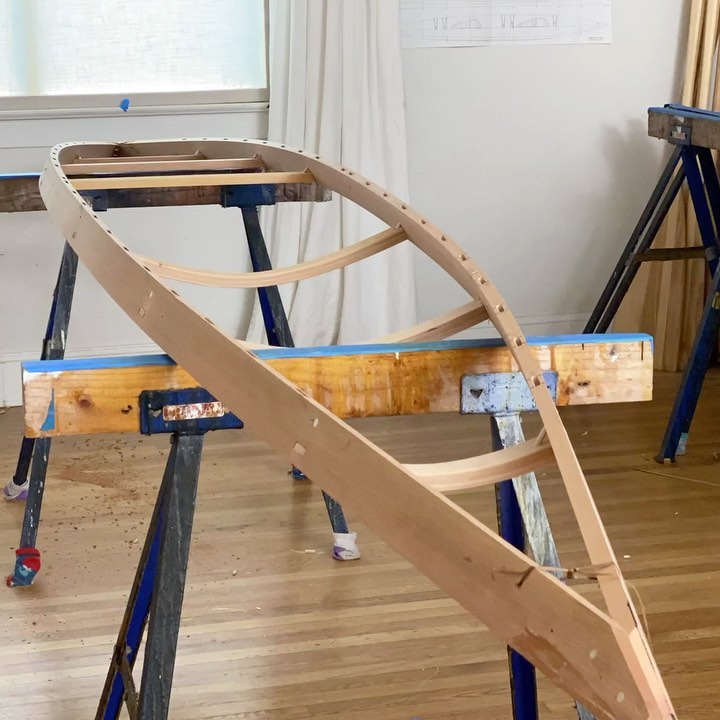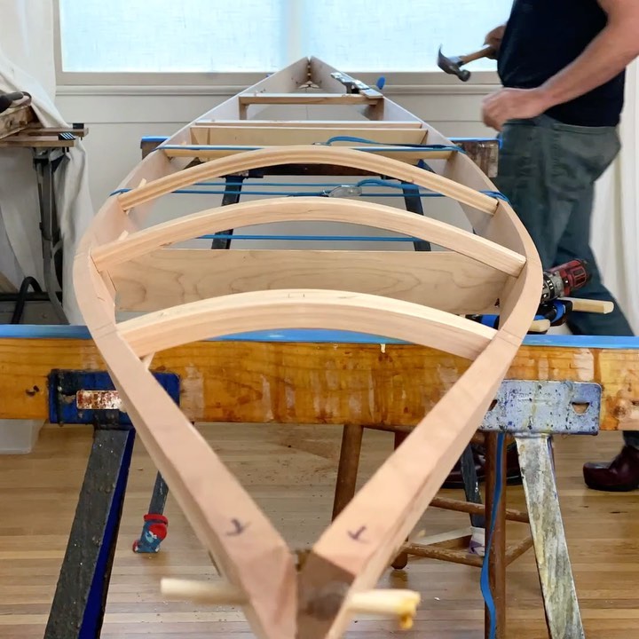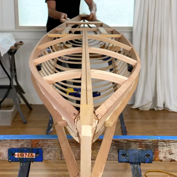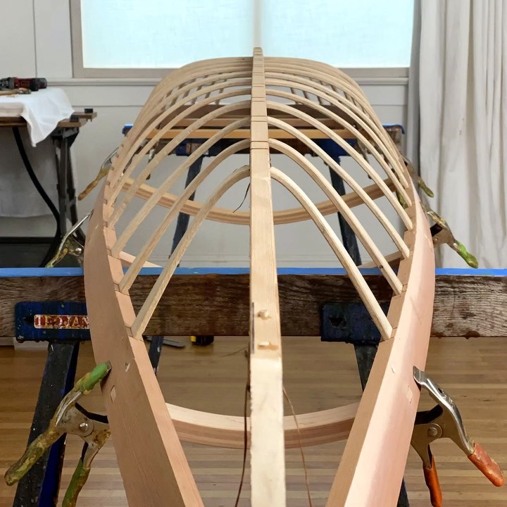 On day 2 of the build I prep and bend in the ribs, tie the keel on, and attach the stems at either end. This is usually a half day of work for me and a full day of work for first time students....