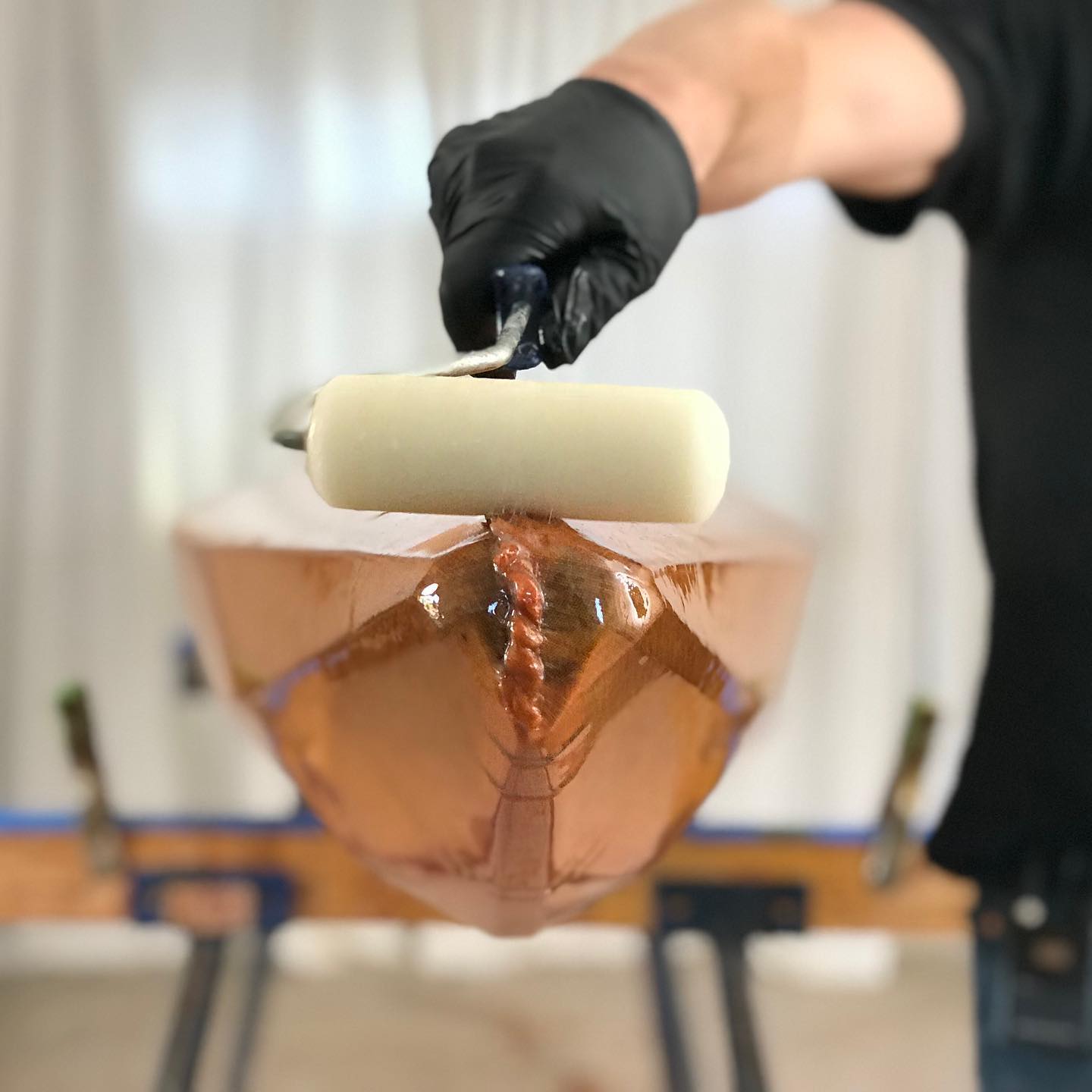 Another long work day. We coated the river kayak today and used the opportunity to reshoot our kayak coating videos to update our ever-evolving tips and instructions and to get clearer views of the process. The coating we use on our kayaks is the two-part polyurethane sold by Corey Freedman at the Skinboat School....