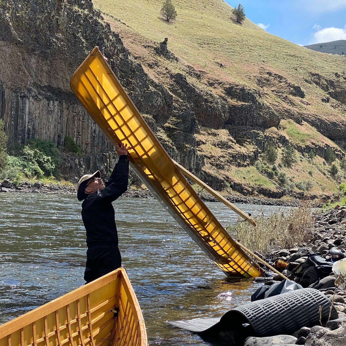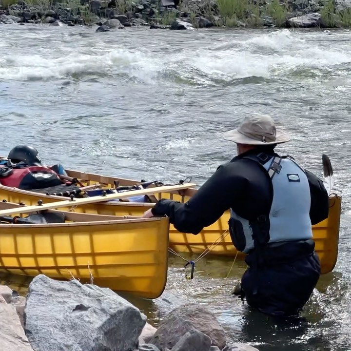 John Day river trip, 4th day on the water. Camping immediately above a 45° round rock slope made loading the Canoes a bit treacherous the next morning. I often turn the canoes upside down at camp and tie rocks to the seats to keep the strong up canyon winds from stealing them. For whatever...