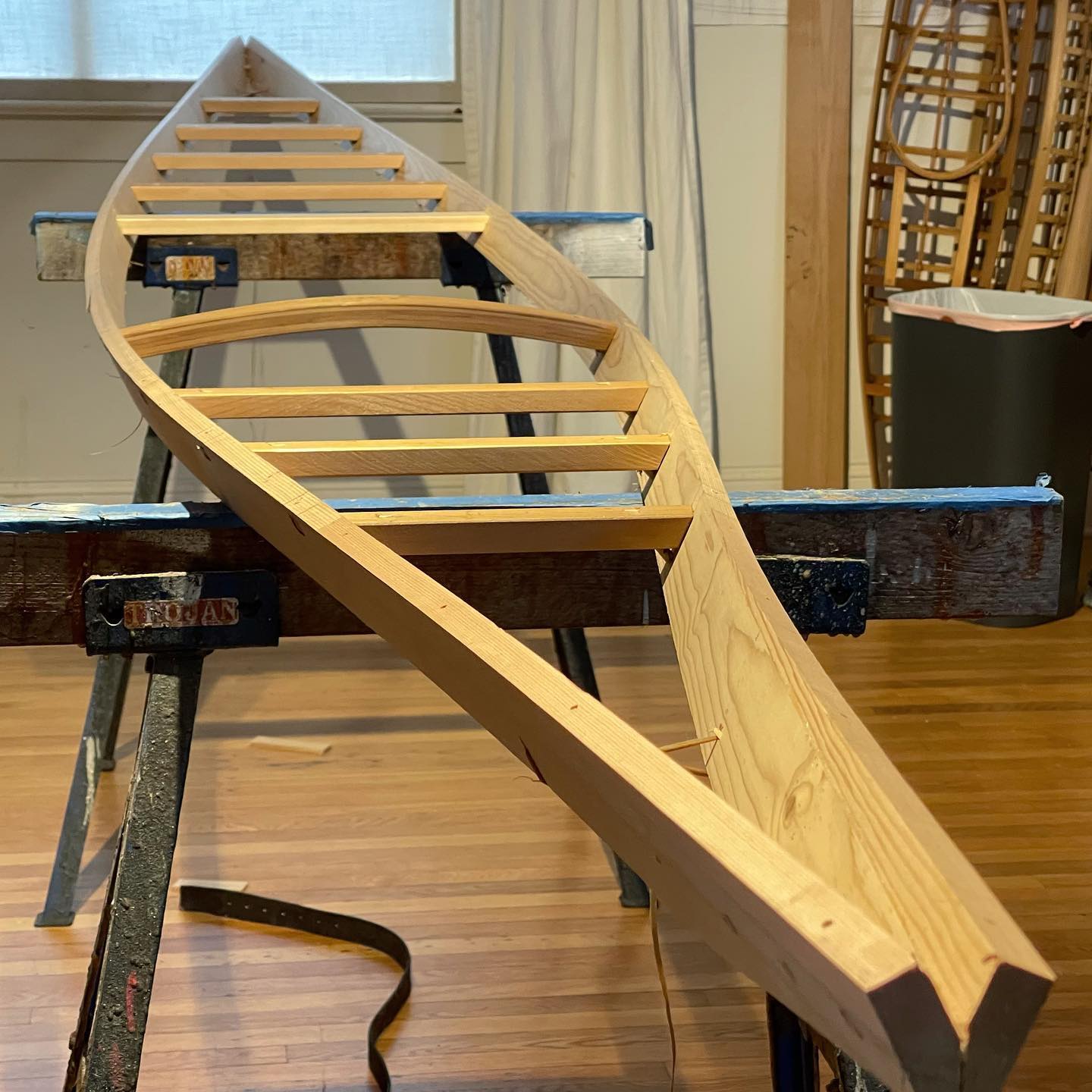 West Greenland Kayak Build, Frame number 3, second water test. After pulling a quarter inch of rocker out of the stern, we wrapped the frame in black plastic and then wrapped it again with the last of my clear plastic which actually ended up adding so much tension that it distorted the frame, but...